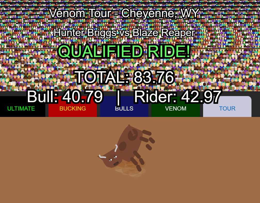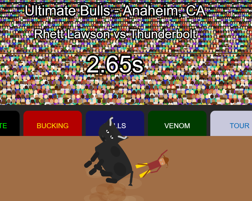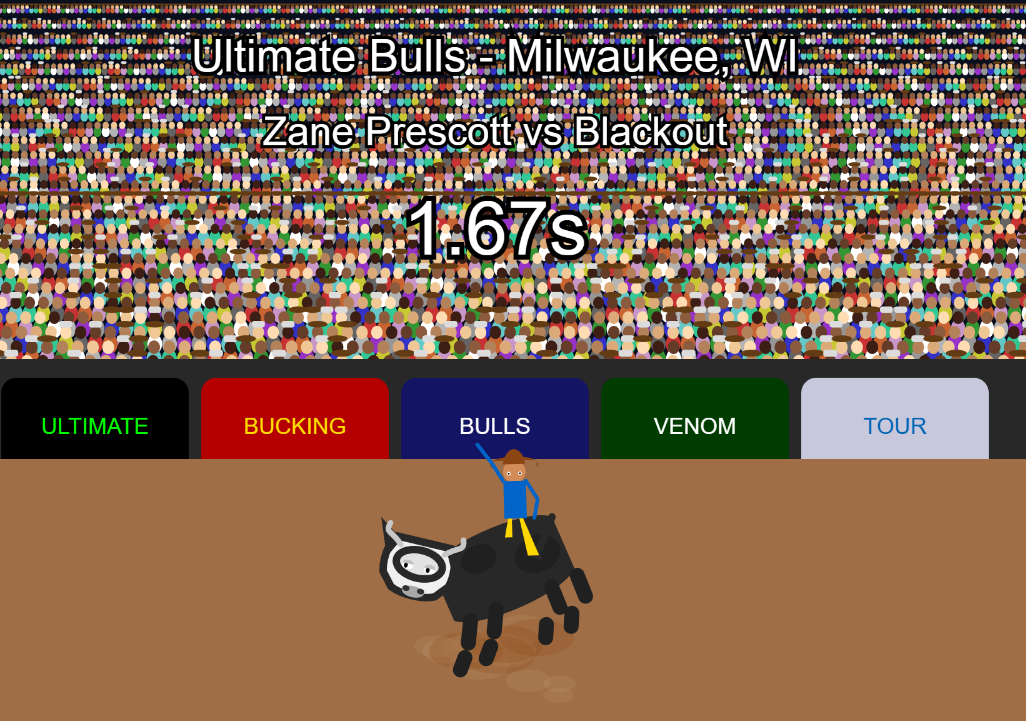 - Achievements: highest bull score, fastest buck-off, top average, top buck-off percentage