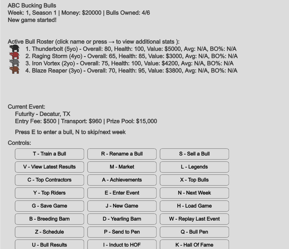 | E | Enter Event | Select eligible bull (1-6) for current event. Checks age/money. Triggers ride animation. Tip: Match age groups: 2yo (104-155w), 3yo (156-207w), 4yo+ (208w+). |