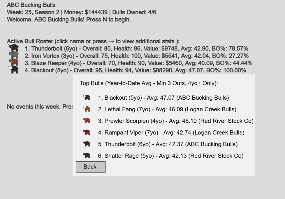 | N | Next Week | Advances week. Pays feed/maintenance. Generates new event. Skips current event (rivals auto-compete). Tip: Use to rest bulls or age yearlings. |