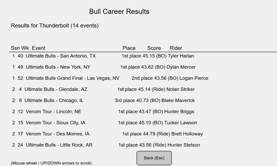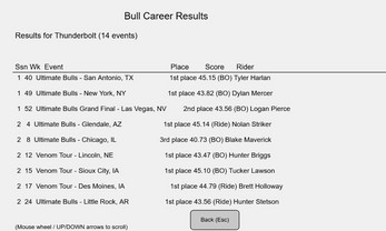 | U | Bull Results | Select bull (1-6) → full career table (season/wk/event/place/score/rider). Scroll: wheel/arrows. Tip: Track legends for Hall of Fame. |